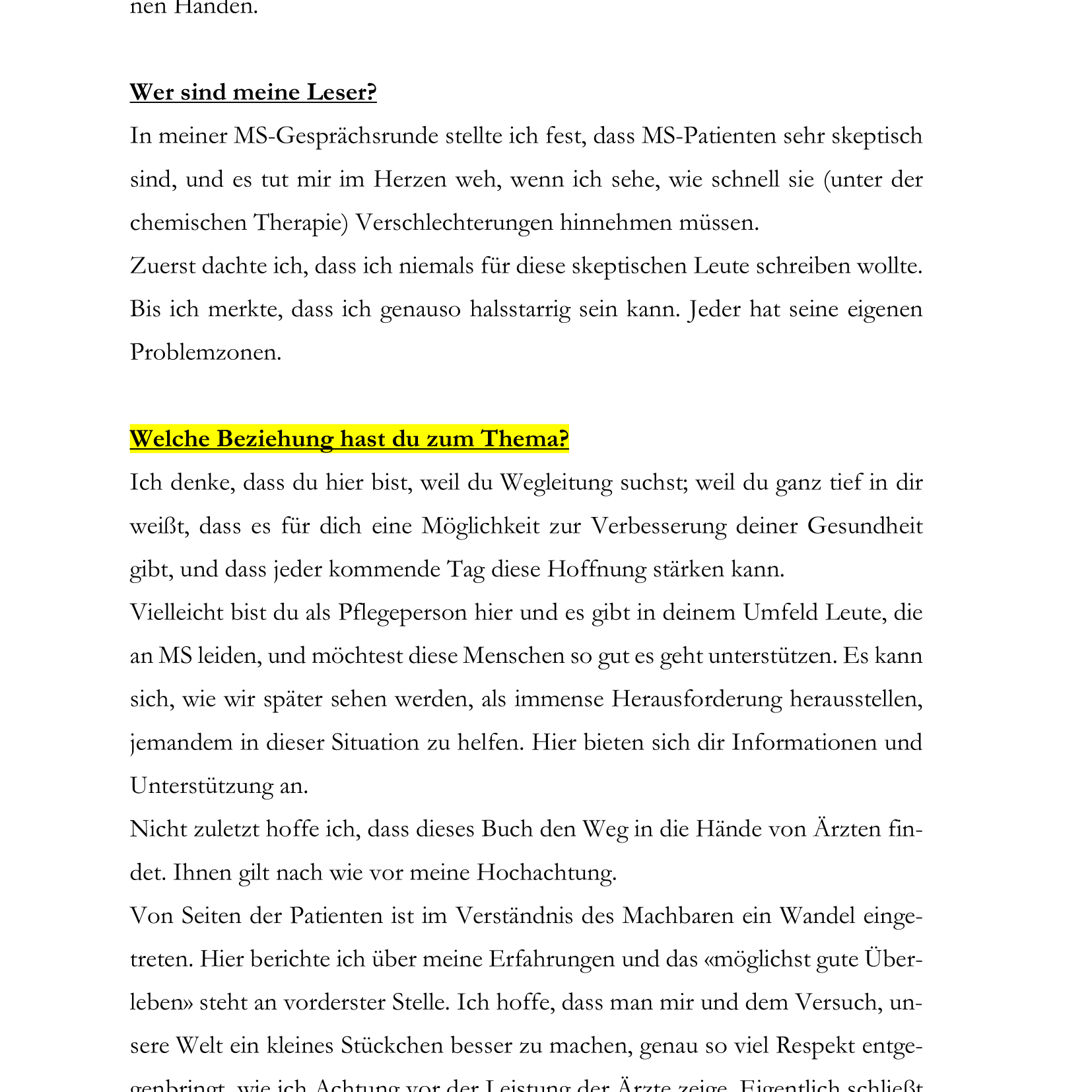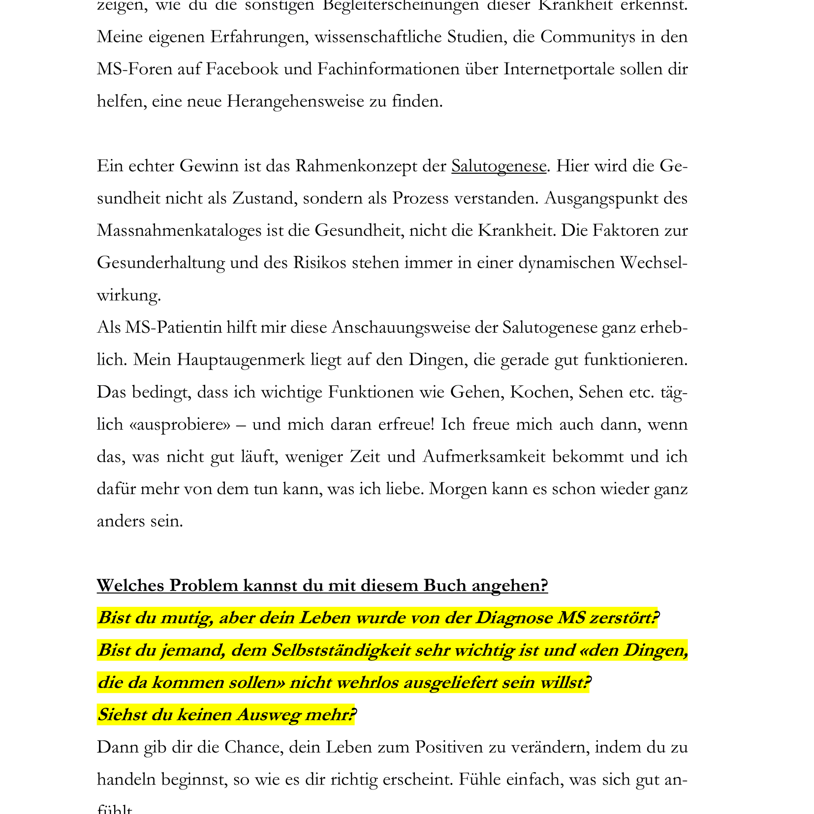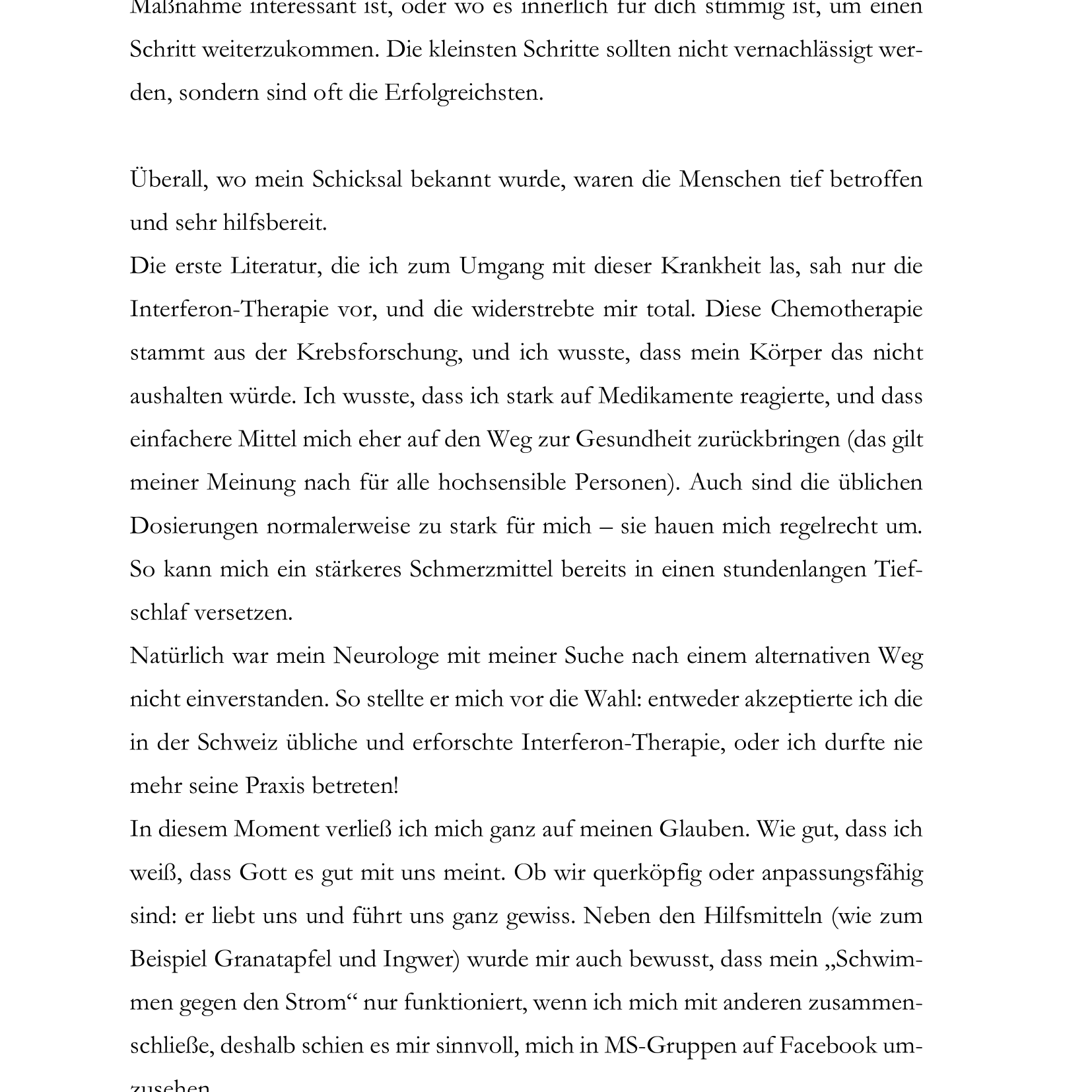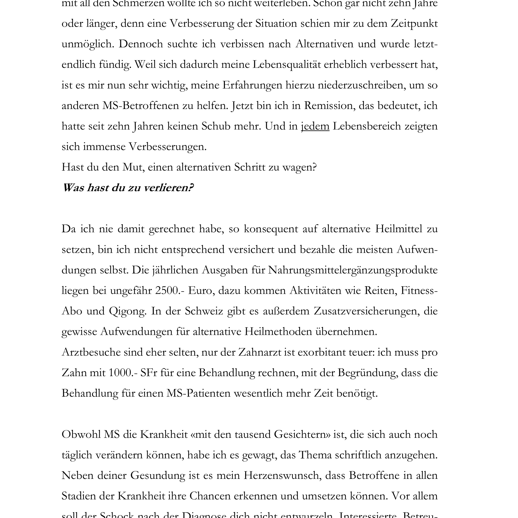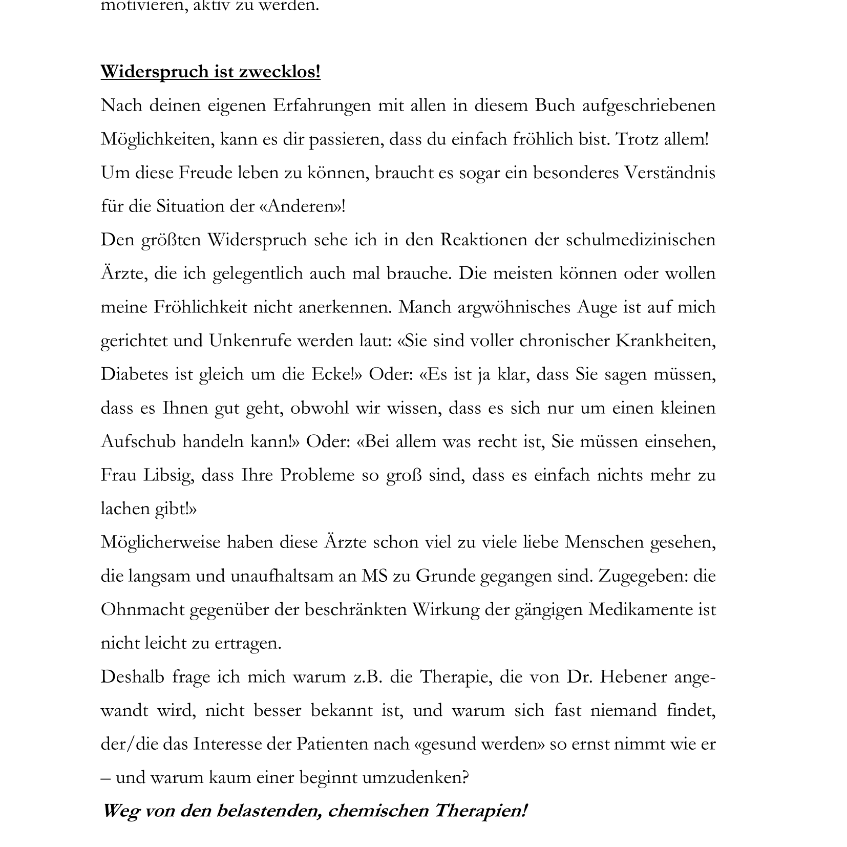 Die Autorin stützt sich vor allem auf ihre Erfahrungen. Als Betroffene eines leichten MS-Verlaufs konnte ich dieses Buch gut lesen. Seriöser weise verspricht D.L. keine Heilung. Dass es ein «möglichst gutes Überleben» anhand der konkreten Ratschläge zur Ernährung und zum Lebensstil geben kann, steht ausser Frage. Hier kann auch der/die Leser/in fündig werden, der /die sich bereits intensiv mit der Lektüre zur Krankheit auseinandergesetzt hat und auf der Suche nach ergänzenden, eventuell auch alternativen, Heil- und Hilfsmitteln zur gängigen Therapie ist. D.L. kann in einem sehr persönlichen und herzlichen Schreibstil eine Unterstützung für den Umgang mit dieser unberechenbaren Krankheit geben.
