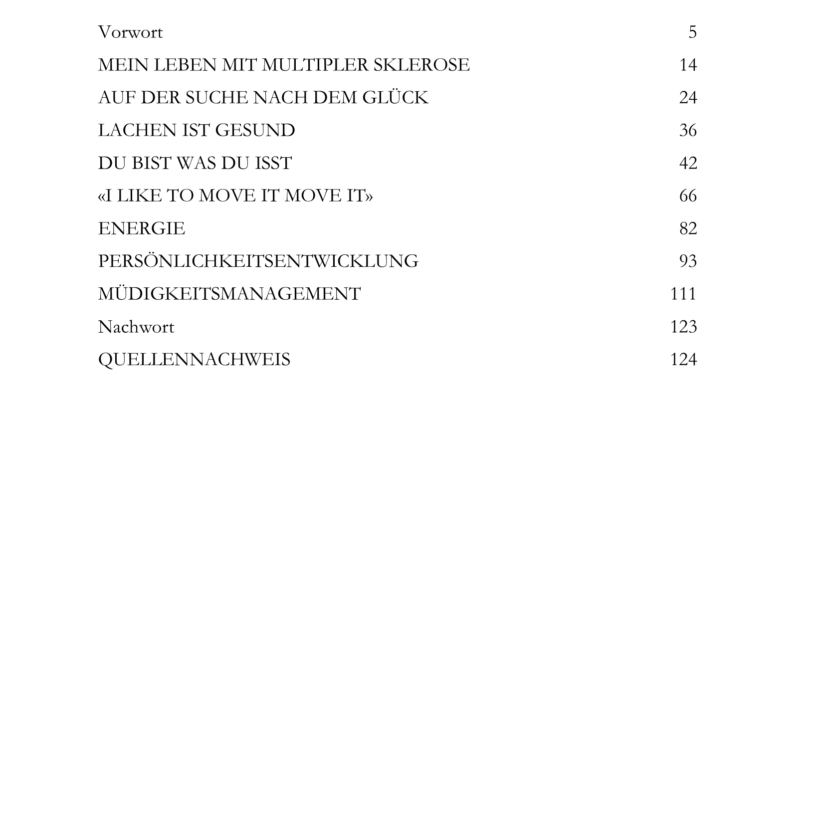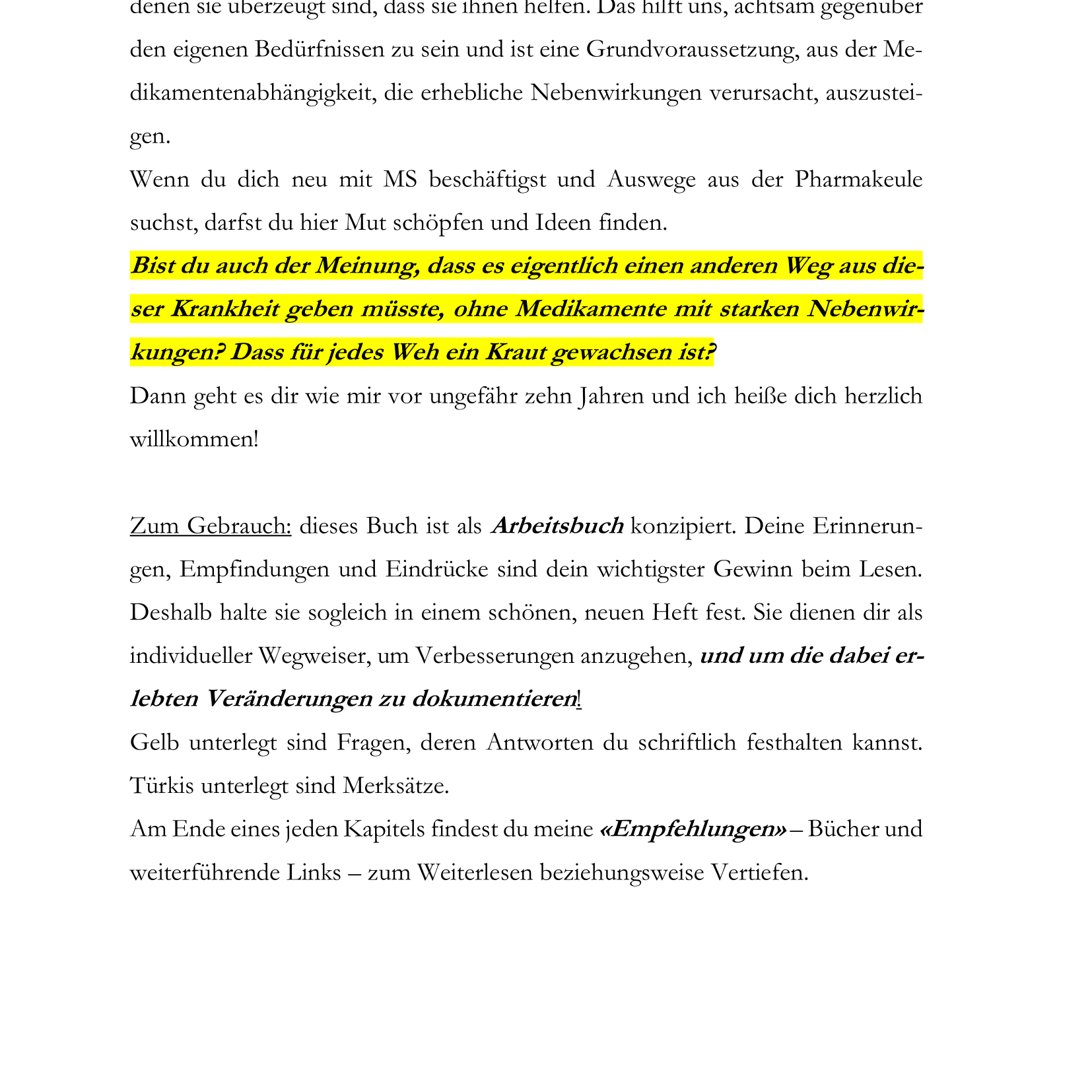 Menschen mit MS müssen aber jeder für sich selbst herausfinden, was für sie das Beste ist und unbedingt auf ihren Körper hören. Dieses Buch mit seinen vielen verschiedenen Tipps zur Ernährung, Bewegung und Meditation soll allen Betroffenen Mut machen, sich ihrer Krankheit zu stellen, sich intensiv damit auseinandersetzen und auf das eigene Körpergefühl zu hören.